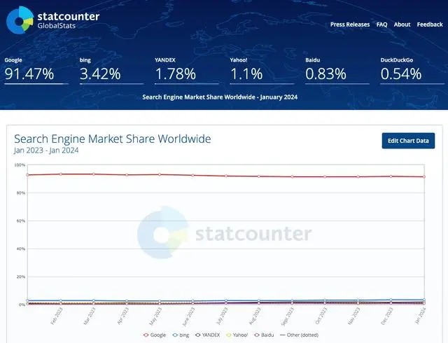 2024年全球搜索引擎市场风云变幻,本文将深入剖析十大搜索引擎及其市场份额排名。